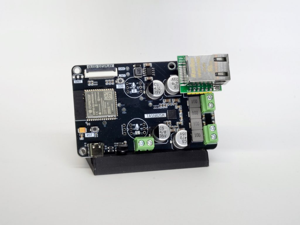 Streaming high-bitrate audio over WiFi can be problematic in congested areas, so every board has a header that allows soldering in the W5500 SPI Ethernet module, which is very easy to source as well. The only downside is that with the module installed board will not fit the case unless it is impoved to accommodate extra height.